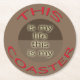 Round coaster with print "THIS is my life. This is my COASTER". Red and tanned colours. Bring your own coaster to keep track on your own drink!