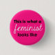 A cute button reading "this is what a feminist looks like," for all the proud feminists out there seeking to show how common and normal embracing feminism is.