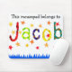 A good quality mousepad with 'This mousepad belongs to Jacob' in colourful handpainted paper collage on a white background. See also matching greeting card and gifts.