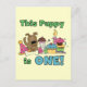 Puppy design first birthday T-shirts, bodysuits, magnets, cards, tote bags, 1st birthday buttons, and more featuring a birthday candle, an adorable brown puppy, a party hat, and lots of birthday treats!