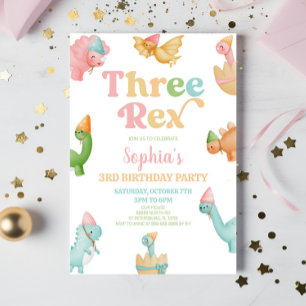 Pastel Girl Dinosaur Three Rex Birthday Party Invitation
