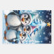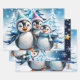 Three adorable penguins stand in festive winter hats and colourful scarves. Their big, round eyes shine with joy, while their fluffy white bellies contrast with the bright blue Christmas tree decorated with twinkling lights. The penguins smile happily and seem ready to celebrate the magic of the holiday season. All around them, delicate snowflakes dance through the air, while twinkling stars shine in the sky, creating a warm, festive atmosphere. This design perfectly captures the spirit of Christmas - full of joy, friendship and winter wonder!
