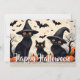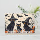 Three black cats with glowing orange eyes sit among pumpkins. Two wear witch hats as bats fly across the sky. A playful yet mystical Halloween scene that blends charm, magic, and a touch of gothic allure.