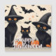 Three black cats with glowing orange eyes sit among pumpkins. Two wear witch hats as bats fly across the sky. A playful yet mystical Halloween scene that blends charm, magic, and a touch of gothic allure.