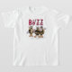 Three adorable bumble bees and bright red big text that reads "BUZZ" on bumble bee T-shirts, cards, stickers, mugs, and other bumble bee gear.