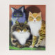 Puzzle in a portrait of three cats with serious attitude - these guys mean business - a Russian Blue, a brown and white Persian, and an orange and white, tiger striped tabby