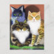 Postcard in a portrait of three cats with serious attitude - these guys mean business - a Russian Blue, a brown and white Persian, and an orange and white, tiger striped tabby