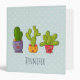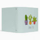 A binder with a whimsical illustration featuring 3 happy little cacti sitting in their own flower pots. They each have their own unique expressions smiling and looking happy. A mint green polka dot pattern background.