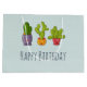 A large happy birthday gift bag. Designed with a whimsical illustration featuring 3 happy little cacti sitting in their own flower pots. They each have their own unique expressions smiling and looking happy. Light mint green polka dot background.