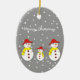 Three cute snowmen custom Christmas ornament featuring three adorable snowmen with red hat, yellow scarf, button eyes and sticks on a grey background with snowflakes.