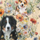 Dogs in wildflowers seamless pattern wallpaper. Beige / cream color paper with yellow lab, Bernese Mountain dog, and cute Corgi.