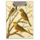 Artist W. Rutledge captured perfectly the vivid colours of those domestic birds. Get this simple yet beautifully realistic painting. Side view of two yellow birds and one darker bird on a branch and looking in different directions.