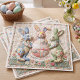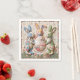 Decorative paper napkins featuring vintage Easter bunnies quilted-style print design. Three adorable fabric-look rabbits with Easter egg basket and "Happy Easter" message. Cottage core shabby chic aesthetic. Perfect for Easter brunch, spring parties, Easter dinner table, or holiday gatherings. Nostalgic charm.