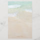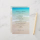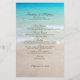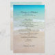 Wedding menu with a tropical beach theme. Pretty, turquoise water and beach sand is the background image with black text in script and printed font. Add text to the templates and create a menu with a first and second course and three entrees. Add the venue name and location and wedding date.