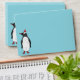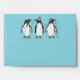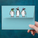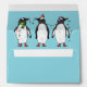 Destei's original illustration of three festive Gentoo penguins holding colourful Christmas lights with their beaks. One penguin is wearing a green scarf, another one is wearing purple ear protection and the third penguin in the middle is wearing a red and white Santa hat. The background colour is light blue.