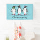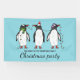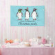 Destei's original illustration of three festive Gentoo penguins holding colourful Christmas lights with their beaks. One penguin is wearing a green scarf, another one is wearing purple ear protection and the third penguin in the middle is wearing a red and white Santa hat. The background colour is light blue. There are also two personalizable text areas.