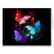 Three luminous, red, purple, green, textured, night butterflies on black luminous background.
