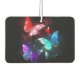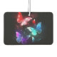 Three luminous, red, purple, green, textured, night butterflies on black luminous background.