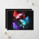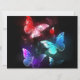 Three luminous, red, purple, green, textured, night butterflies on black luminous background.