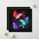 Three luminous, red, purple, green, textured, night butterflies on black luminous background.