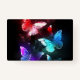 Three luminous, red, purple, green, textured, night butterflies on black luminous background.