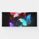 Three luminous, red, purple, green, textured, night butterflies on black luminous background.