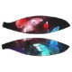 Three luminous, red, purple, green, textured, night butterflies on black luminous background.