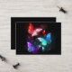 Three luminous, red, purple, green, textured, night butterflies on black luminous background.