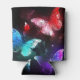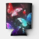 Three luminous, red, purple, green, textured, night butterflies on black luminous background.