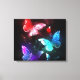 Three luminous, red, purple, green, textured, night butterflies on black luminous background.
