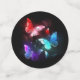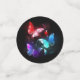 Three luminous, red, purple, green, textured, night butterflies on black luminous background.