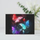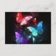 Three luminous, red, purple, green, textured, night butterflies on black luminous background.