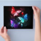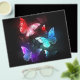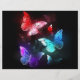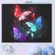 Three luminous, red, purple, green, textured, night butterflies on black luminous background.
