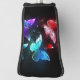 Three luminous, red, purple, green, textured, night butterflies on black luminous background.