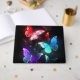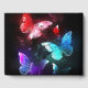 Three luminous, red, purple, green, textured, night butterflies on black luminous background.