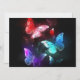 Three luminous, red, purple, green, textured, night butterflies on black luminous background.