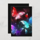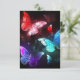 Three luminous, red, purple, green, textured, night butterflies on black luminous background.