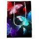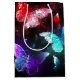Three luminous, red, purple, green, textured, night butterflies on black luminous background.