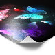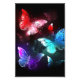 Three luminous, red, purple, green, textured, night butterflies on black luminous background.