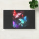 Three luminous, red, purple, green, textured, night butterflies on black luminous background.