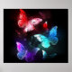 Three luminous, red, purple, green, textured, night butterflies on black luminous background.