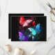 Three luminous, red, purple, green, textured, night butterflies on black luminous background.