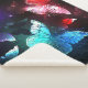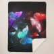 Three luminous, red, purple, green, textured, night butterflies on black luminous background.