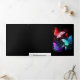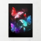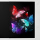 Three luminous, red, purple, green, textured, night butterflies on black luminous background.