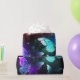 Three luminous, red, purple, green, textured, night butterflies on black luminous background.