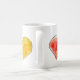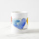 Three watercolor hearts on a coffee mug. Golden yellow, true blue and bright red. PERSONALIZE by hitting the customize button. Add your own custom message, choose from several fonts, from formal to casual. Change the style of mug, get accent colours or the heat disappearing mug.