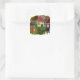 Art by Marta Harvey. The houses were created with painted papers made with different techniques, and edged with gel pens. The background was made with painted paper towels. The flowers were made with a round hole punch on painted papers and then the petals, leaves and stalks drawn with pen and ink.