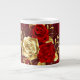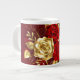 The composition of two artistically painted red roses and one golden rose, decorated with gold, jewel leaves on textured background.
