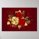The composition of two artistically painted red roses and one golden rose, decorated with gold, jewel leaves on textured background.