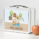 This custom lunch box features a colourful children's folk and fairy tale theme. The three little pigs from the classic fairytale story are pictured standing near their huts of straw, sticks, and bricks. The Big Bad Wolf is seen creeping in the distance. A sample name is printed below the illustration in a whimsical black font. You can personalize the lunch box to include your own custom name or text.